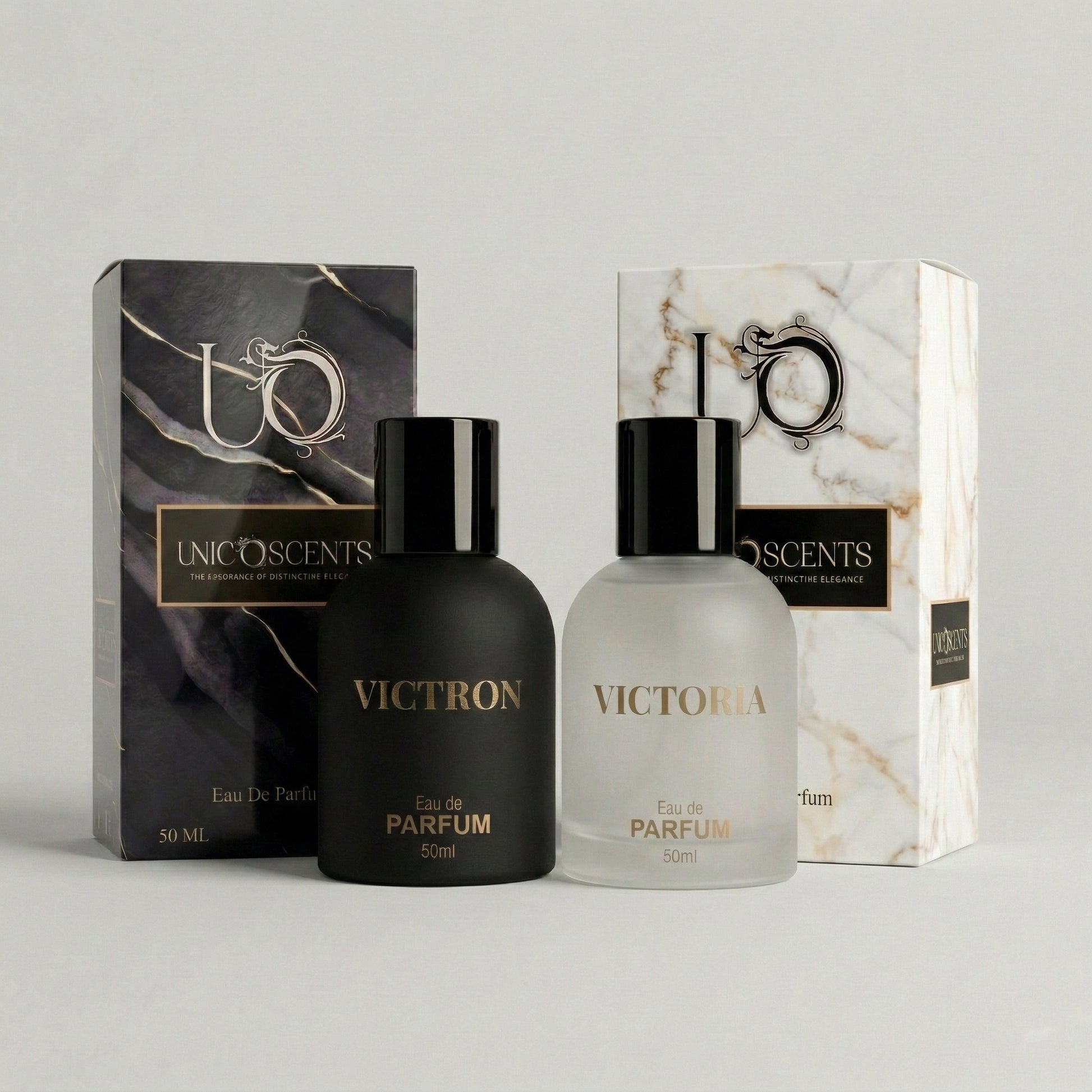 • Victoria (50ml): A luminous, feminine fragrance that radiates grace. Housed in a frosted white bottle, it is the perfect counterpart to Victron’s intensity.